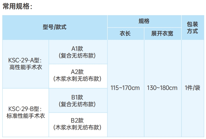 使用范围: 用于穿在手术医生和擦拭护士身上,起到防止医生身体上的皮屑弥散到开放的手术创面和手术病人的体液向医务人员传播,起到双向生物防护的作用。高性能产品适用于病人血液中已知有传染性病毒或紧急抢救时未知血液中是否有传染性病毒的手术;标准性能产品适用于已知病人血液中无传染性病毒的手术。