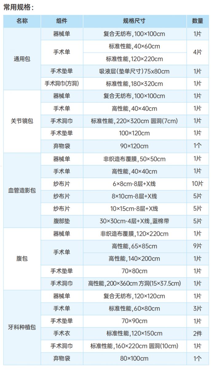 产品介绍: 由基本件和选配件组成,基本件包括器械单、手术单,选配件包括手术垫单、手术衣、手术洞巾、橡胶外科手套、纱布片、腹部垫、器械台套、弃物袋。产品经环氧乙烷灭菌后,无菌提供。